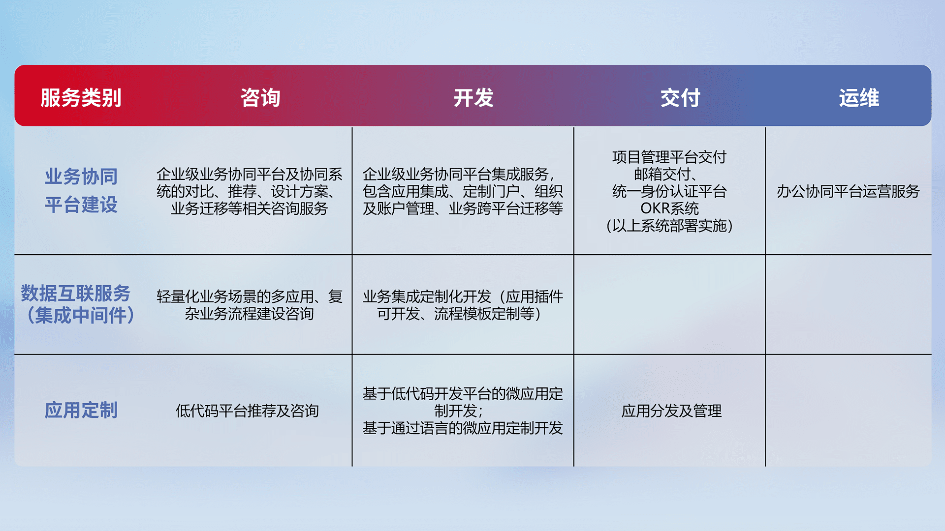针对钉钉、、、企微、、IDaas等平台级产品提供产品的规划、、方案、、、、交付、、、定制化开发等服务,,实现如统一协同办公、、、、智能客户服务、、、、混合会议管理、、、智能数据查询、、、等业务场景,,,实现数字化转型。。。。
