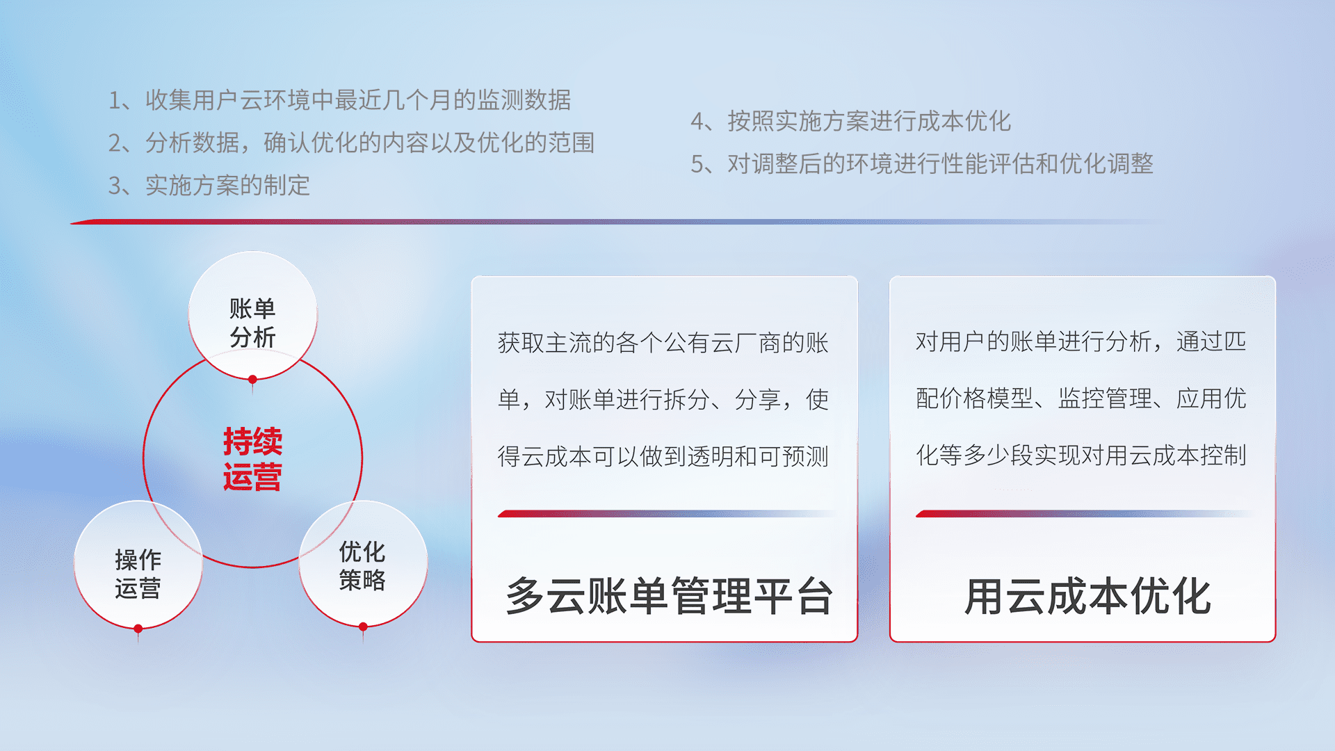 通过多云纳管,,以统一的资源数据模型把客户的云资源进行抽象和封装,,,进而实现对多云资源的统一操作,,,保障云资源管理的可靠性、、、稳定性与可用性。。。量身定制化运维内容,,配置、、开发运维、、补丁管理、、备份、、、、监控、、、认证和访问管理、、、审计和日常巡检等,,,保障在用云过程中的可靠度,,,,稳定度以及高可用率。。。